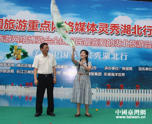 湖北省旅游局副巡視員劉晗為“靈秀湖北行”授旗。(中國臺(tái)灣網(wǎng) 李杰 攝)