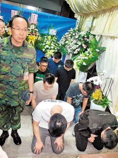 中國臺灣網(wǎng)7月9日消息 據(jù)臺灣《中國時報》報道,臺陸軍五四二旅役男洪仲丘疑因臺軍方操練失當身亡,負責操練洪男的臺陸軍六軍團二六九旅的政戰(zhàn)主任陳毅銘帶領(lǐng)禁閉室室長、副室長及5名戒護管理員,昨(8)日晚9時許抵達洪家,在洪靈前上香致意。家屬憤怒表示,沒有獲得臺軍方合理交代,就絕不輕易下葬。“仲丘,對不起!我們沒有好好照顧你。”陳毅銘帶領(lǐng)一行人等,在洪仲丘靈堂前上香,并對家屬深深一鞠躬,表示歉意。