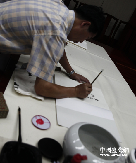 臺中市政府參事兼主任、勤益大學文創(chuàng)系助理教授更是在河北省圖書館揮毫潑墨,留下“圖書架滿開大運 翰墨春回擁冀州”。ㄖ袊_灣網(wǎng) 高斯斯 攝)
