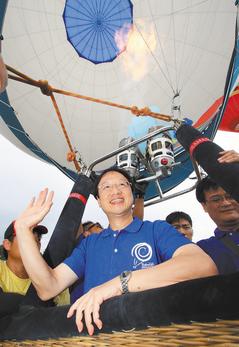 有馬英九力挺,“行政院長(zhǎng)”江宜樺(中)昨天將“請(qǐng)辭”傳聞拋在腦后,展現(xiàn)自信體驗(yàn)臺(tái)東熱氣球“高飛”的快感。圖片來源:臺(tái)灣《聯(lián)合報(bào)》