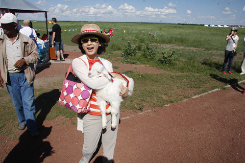 臺(tái)灣文化界人士來到敖包前,紛紛拿起祭祀的平安帶,圍繞著敖包走上三圈,然后把平安帶系在敖包上,為家人祈福。原臺(tái)灣著名電視主持人、臺(tái)中市文化局長(zhǎng)葉樹姍祭祀完敖包,又走到草地上抱著一只剛出生20天的潔白的小羊羔,讓朋友幫她拍照留念。她疼愛地說,我覺的這只小羊就像是我前世的女兒。