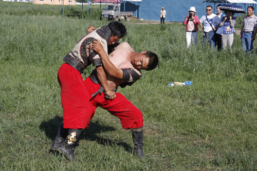 蒙古族的小伙子為臺(tái)灣嘉賓表演蒙古式摔跤(中國(guó)臺(tái)灣網(wǎng) 蕪?fù)?nbsp;攝)