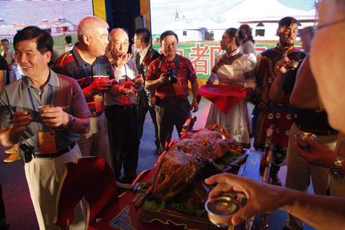 宴會(huì)主人為臺(tái)灣嘉賓奉上蒙古族的最高歡迎禮:烤全羊(中國(guó)臺(tái)灣網(wǎng) 蕪?fù)?nbsp;攝)