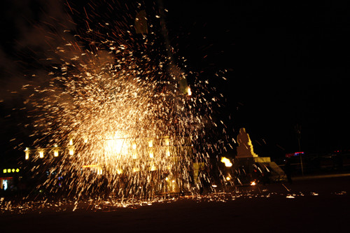 在篝火晚會現(xiàn)場,蒙古族勇士表演打樹花,將1600度的鐵水潑向天空,形成美麗的火花(中國臺灣網(wǎng) 蕪?fù)?nbsp;攝)