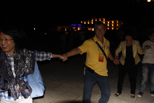 參加篝火晚會的臺灣嘉賓完全融入了跳舞的人群中(中國臺灣網(wǎng) 蕪?fù)?nbsp;攝)