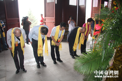 臺(tái)灣參訪團(tuán)團(tuán)長(zhǎng)嚴(yán)雋泰、中華文化聯(lián)誼會(huì)副秘書長(zhǎng)李保宗代表全體人員敬獻(xiàn)花籃(中國(guó)臺(tái)灣網(wǎng) 蕪?fù)?nbsp;攝)