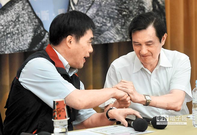 馬英九為連任國民黨主席全力沖刺,懇托會(huì)上臺(tái)北市長(zhǎng)郝龍斌致完詞后。圖片來源:臺(tái)灣《中國時(shí)報(bào)》