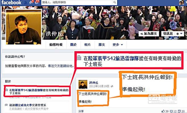 洪仲丘在臉書自陳“在路軍裝甲542旅擔(dān)任有時爽有時飛的下士班長”,還留言“下士班長洪仲丘報到!準備起飛”,不料卻在退伍前夕被關(guān)禁閉致死。圖片來源:臺灣《中國時報》