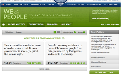 “We The People”網(wǎng)站是美國(guó)白宮設(shè)立,針對(duì)重要議題讓人民有權(quán)利要求政府采取行動(dòng)和響應(yīng),只要獲得網(wǎng)絡(luò)上10萬(wàn)人聯(lián)署,美國(guó)官方就必須正式響應(yīng),目前洪案僅有1521人聯(lián)署。(中國(guó)臺(tái)灣網(wǎng) 王文英)