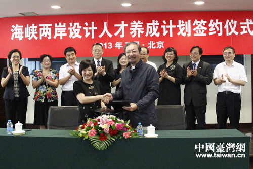 中國臺灣網(wǎng)7月18日北京消息 7月17日,由北京兩岸文創(chuàng)人才發(fā)展中心舉辦的海峽兩岸設(shè)計人才培養(yǎng)計劃簽約儀式在民革中央禮堂舉行。民革中央副主席、北京兩岸文創(chuàng)人才發(fā)展中心名譽理事長鄭建邦,歌華集團董事長王建琪,臺灣文化創(chuàng)意產(chǎn)業(yè)聯(lián)盟名譽理事長李永萍等來自兩岸的文創(chuàng)界人才以及相關(guān)企業(yè)參與了簽約儀式。會上,北京兩岸文創(chuàng)人才發(fā)展中心副理事長石海燕與臺灣文化創(chuàng)意產(chǎn)業(yè)聯(lián)盟理事長林磐聳分別代表兩岸文創(chuàng)團隊進行了簽約。