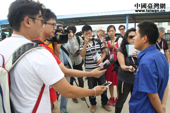 張亮在辦公樓外接受臺灣記者采訪(中國臺灣網(wǎng) 王文英 攝)