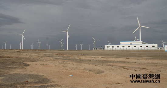 甘肅酒泉風(fēng)力發(fā)電有限公司戈壁灘風(fēng)電基地上正在運(yùn)轉(zhuǎn)的大面積風(fēng)車(中國(guó)臺(tái)灣網(wǎng) 王文英 攝)