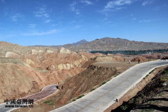 “海峽兩岸記者西北行”聯(lián)合采訪團(tuán)參訪張掖丹霞國家地質(zhì)公園,感受中國第一七彩丘陵神奇景觀。(中國臺灣網(wǎng) 王文英 攝)