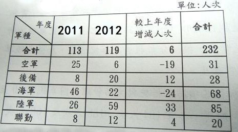 綜合臺灣媒體報道,臺軍官兵2012年違紀案件23096人次,依臺軍預算員額21萬余人計算,違紀比率達11%,較往年增加許多。其中,士兵部分2010年違紀的僅944人次,2012則年增加到3253人次,增幅達244%;士官部分從6644人次增加到8779人次;軍官部分從9267人次,增加到11000人次。將官部分則從86人次減為64人次。