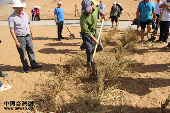 沙坡頭技術(shù)人員向兩岸記者實(shí)際演示麥草方格技術(shù)(中國臺灣網(wǎng) 王文英 攝)
