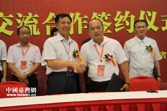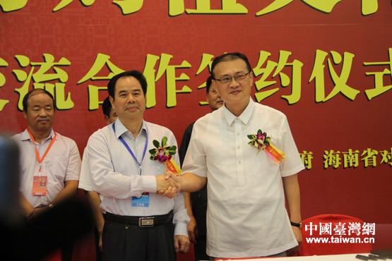海南省對(duì)外經(jīng)濟(jì)發(fā)展促進(jìn)會(huì)與臺(tái)灣漁業(yè)協(xié)會(huì)簽約。(中國(guó)臺(tái)灣網(wǎng) 李丹 攝)