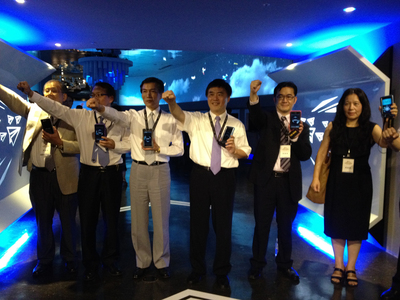 臺(tái)北花博公園“行動(dòng)夢(mèng)想館”8月1日開館,7月31日舉行開幕記者會(huì),華碩副董事長(zhǎng)曾鏘聲(左3)、臺(tái)北市長(zhǎng)郝龍斌(右3)等體驗(yàn)最新互動(dòng)科技。(圖片來自臺(tái)媒)
