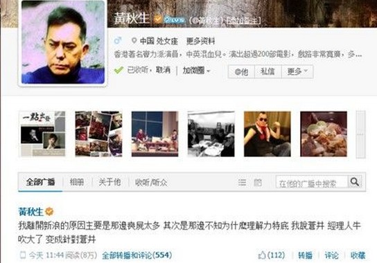 7月30日,黃秋生終于在騰訊微博發(fā)聲,就離開(kāi)新浪一事表態(tài),把原因歸咎于“喪尸太多”。