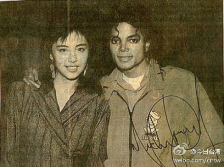 王祖賢與邁克爾杰克遜合影舊照。(圖片取自“今日臺灣”微博)