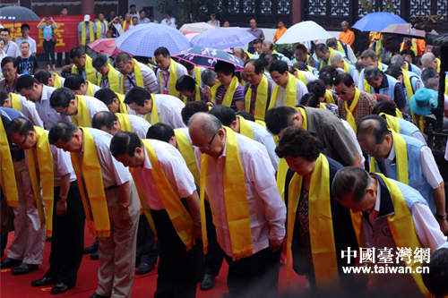 中國(guó)國(guó)民黨榮譽(yù)主席吳伯雄(前排右三)率臺(tái)灣客家鄉(xiāng)親向炎黃二帝及客屬列祖列宗鞠躬。(中國(guó)臺(tái)灣網(wǎng) 郜利敏 攝)