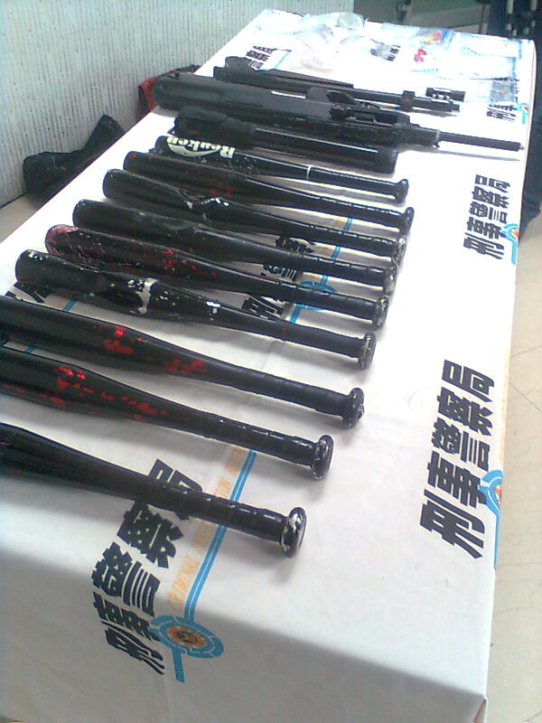 臺(tái)灣警方破獲四海幫暴力集團(tuán),逮捕海山堂湯姓堂主等13人,查出大批球棒和一把空氣長(zhǎng)槍。(圖片來自臺(tái)灣“中廣新聞網(wǎng)”)