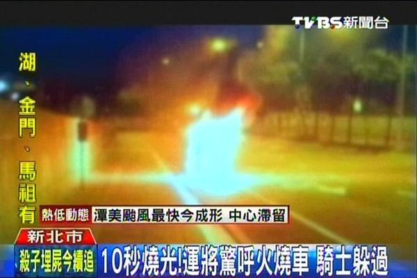 摩托車變成一大團(tuán)火球,上方還不停冒出陣陣濃煙,行車紀(jì)錄器拍攝下這驚險(xiǎn)瞬間。(圖片來(lái)自臺(tái)灣TVBS)