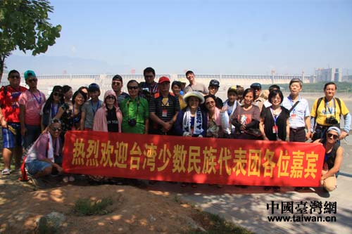 臺灣少數(shù)民族同胞在三峽大壩前合影留念。(中國臺灣網(wǎng) 雍紫薇 攝)