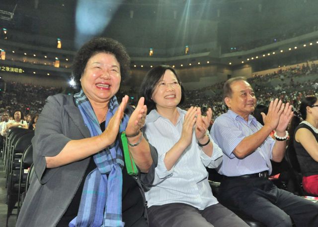 高雄市長(zhǎng)陳菊(左)、民進(jìn)黨前主席蔡英文觀賞詹雅雯演唱會(huì)。(圖片來(lái)自臺(tái)媒)