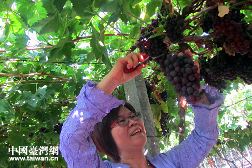 參訪團(tuán)成員在兵農(nóng)葡萄莊園體驗(yàn)采摘。(中國(guó)臺(tái)灣網(wǎng) 王偉 攝)