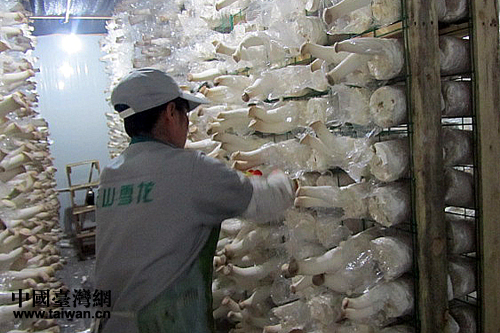 工人在采摘食用菌。(中國(guó)臺(tái)灣網(wǎng) 王偉 攝)