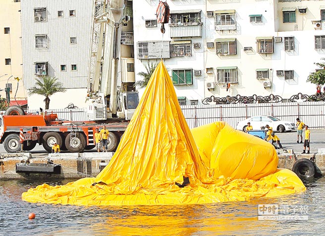 小黃鴨在海面上進行充氣。(圖片來自臺媒)