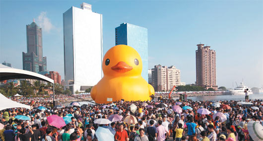 由荷蘭藝術(shù)家霍夫曼設(shè)計并授權(quán)高雄市展出的黃色小鴨(Rubber Duck),昨天下午4點,在3艘大型拖船鳴笛、噴水柱的“貴賓級”迎賓儀式中,緩緩“游”進(jìn)高雄光榮碼頭,第1天共有20萬人爭睹這只高18米高的超萌小鴨。(來源:臺灣《聯(lián)合報》)