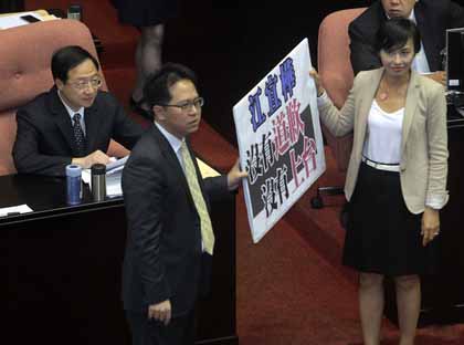 據(jù)臺灣媒體報(bào)道,臺“立法院”今天上午“國是論壇”結(jié)束后,民進(jìn)黨“立委”聚集在發(fā)言臺前高喊抗議江宜樺的口號!傲⑽鼻裰緜、邱議瑩拿著“沒有道歉,沒有上臺”標(biāo)語,站在江宜樺位子前,江宜樺依舊自顧處理公文,偶爾抬頭看一下場內(nèi)狀況。