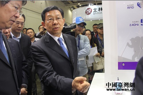 開(kāi)幕式結(jié)束后,領(lǐng)導(dǎo)和嘉賓進(jìn)入展廳參觀展會(huì)。圖為海協(xié)會(huì)會(huì)長(zhǎng)陳德銘在臺(tái)企旺宏電子展臺(tái)前參觀。(中國(guó)臺(tái)灣網(wǎng) 王怡然 攝)
