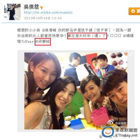 吳佩慈在微博上爆料梁靜茹懷孕消息(圖片來自臺(tái)媒)