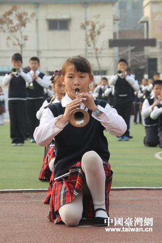沁陽市實(shí)驗(yàn)小學(xué)學(xué)生表演千人嗩吶演奏,歡迎臺灣師生代表參訪。圖為演奏嗩吶的沁陽市實(shí)驗(yàn)小學(xué)學(xué)生。(中國臺灣網(wǎng) 扶海濤 攝)