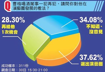 臺(tái)媒昨針對(duì)“曹格喝酒鬧事一犯再犯,請(qǐng)問(wèn)你對(duì)他在演藝圈發(fā)展的看法?”進(jìn)行民調(diào),311份樣本中,37.62%民眾認(rèn)為他應(yīng)退出演藝圈,28.3%民眾認(rèn)為應(yīng)再給他1次機(jī)會(huì),34.08%民眾則表示不知道、沒(méi)意見(jiàn)。(中國(guó)臺(tái)灣網(wǎng) 高旭)