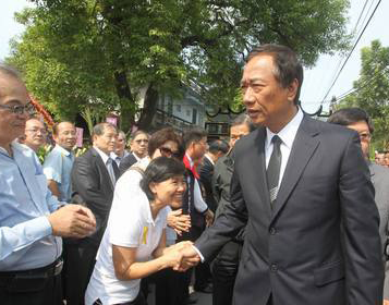 鴻海集團(tuán)董事長(zhǎng)郭臺(tái)銘(右一)也出席告別式,離去時(shí)不少民眾上前與他握手。(圖片來(lái)自臺(tái)媒)