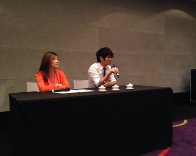 曹格(右)在經(jīng)紀人陪同開記者會,宣布戒酒。(臺媒圖)