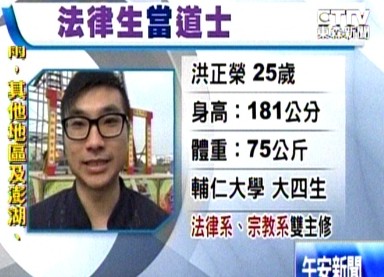 大四學生洪正榮因為熱愛宗教,回鄉(xiāng)參加成功登刀梯、下釘梯,晉升為正式道士。他年僅25歲,就讀輔仁大學,由于興趣選讀法律系和宗教系雙主修,未來還想當一名人權(quán)律師。洪正榮說:“希望藉由神的力量以及未來的法律專業(yè),希望帶給這個社會更大的幫助!彼f鄰居伯公就是道士,從小到大耳濡目染,大三時就決定將對臺灣的宗教文化熱情化為行動,現(xiàn)在付諸實行夢想成真。(中國臺灣網(wǎng) 高旭)