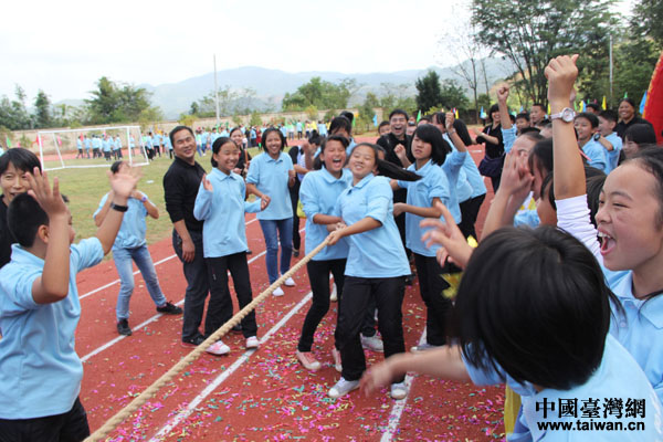 剪彩儀式后舉行的趣味運(yùn)動(dòng)會(huì)上,頂新基金會(huì)工作人員與學(xué)生們同樂(中國臺(tái)灣網(wǎng) 蕪?fù)?攝)