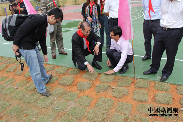 頂新公益基金會(huì)理事長滕鴻年檢查捐建的梅林鎮(zhèn)中心小學(xué)運(yùn)動(dòng)場工程時(shí),仔細(xì)檢查工程質(zhì)量(中國臺(tái)灣網(wǎng) 蕪?fù)?攝)