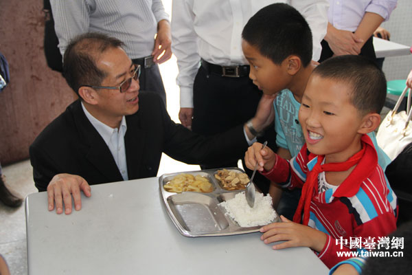 頂新公益基金會(huì)理事長滕鴻年看望長期支持的古竹中心小學(xué)時(shí),與正吃飯的小學(xué)生平等交談(中國臺(tái)灣網(wǎng) 蕪?fù)?攝)