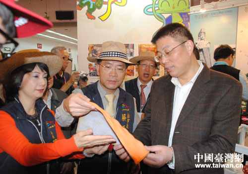 11月9日上午,北京市副市長戴均良(右)在臺(tái)中市副市長蔡炳坤(中)和臺(tái)中市文化局長葉樹姍(左)陪同下,參觀第八屆文博會(huì)臺(tái)灣文創(chuàng)精品館。(中國臺(tái)灣網(wǎng)北京通訊員 郭寧 攝)