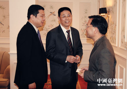 北京市副市長戴均良(中)11月8日下午會(huì)見由臺(tái)中市副市長蔡炳坤(右)任名譽(yù)團(tuán)長的臺(tái)灣文創(chuàng)參訪團(tuán)一行。北京市臺(tái)辦主任汪明浩陪同會(huì)見(左)。(中國臺(tái)灣網(wǎng)北京市通訊員 郭寧 攝)