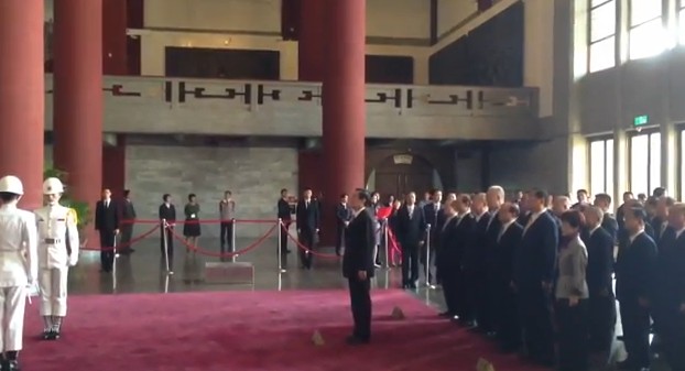 中山紀(jì)念館正廳前,維安單位拉起管制線,一般民眾無法進(jìn)入正廳;馬英九敬禮后,步出正廳,吸引相當(dāng)多民眾圍觀。
