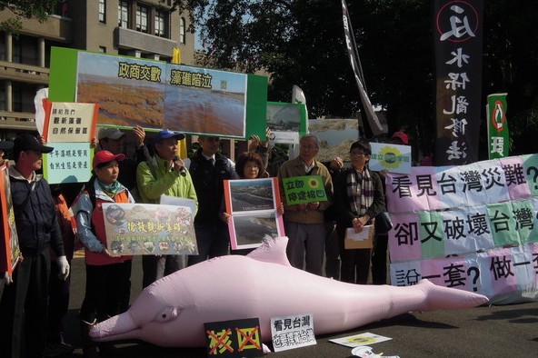環(huán)保團(tuán)體持“綠牡蠣”批江:說一套、做一套。(臺(tái)媒圖)