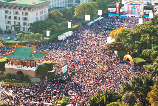 臺灣伴侶權益推動聯(lián)盟(以下簡稱伴侶盟)在“立法院”前發(fā)起“300人排字活動”,大家高舉粉紅色牌,堆棧出“婚姻平權”字樣,齊聲吶喊“婚姻平權,我要成家!”參與者超出伴侶盟預期,估計現(xiàn)場超過1000人。