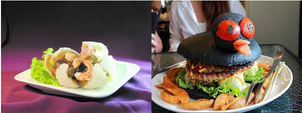 “進擊的美食”其中兩道巨無霸海鮮肉圓(左)、姜母鴨漢堡(右)。(圖片來自臺媒)