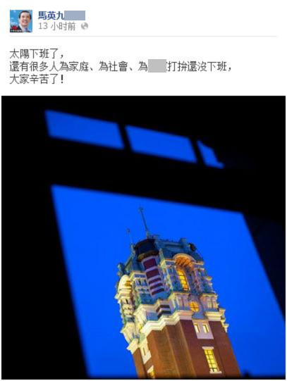 馬英九的臉書(shū)大多是PO出前一天重要場(chǎng)合的公開(kāi)發(fā)言,或針對(duì)特定紀(jì)念日發(fā)文,少有短訊,但12日下班時(shí)間卻發(fā)文說(shuō):“太陽(yáng)下班了,還有很多人為家庭、為社會(huì)、為臺(tái)灣打拼還沒(méi)下班,大家辛苦了!”,結(jié)果卻遭到島內(nèi)網(wǎng)友痛罵,指責(zé)他不知民間疾苦。(圖片來(lái)源:馬英九個(gè)人臉書(shū)網(wǎng)頁(yè))